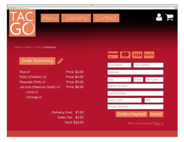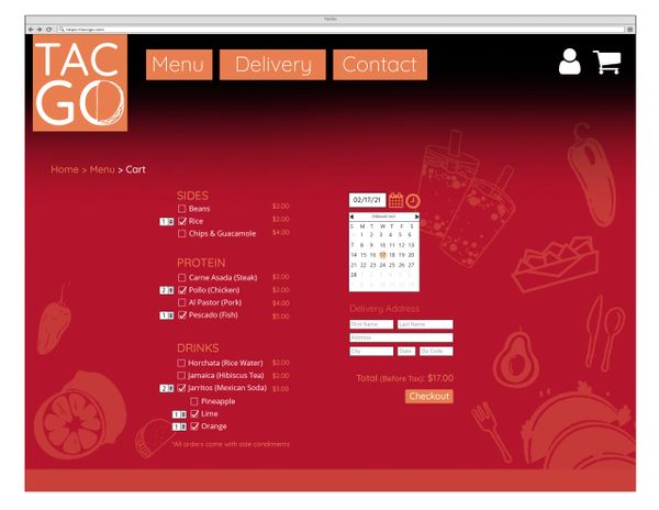 TacGo is an online food delivery site within the Chicagoland area serving their customers with a customizable selection of Mexican cuisine. The typical user is between 18-45 years old TacGo is made for a fast and easy user experience for all types of customers. The site allows users to customize meals and get it delivered to the comfort of their own home or workplace.